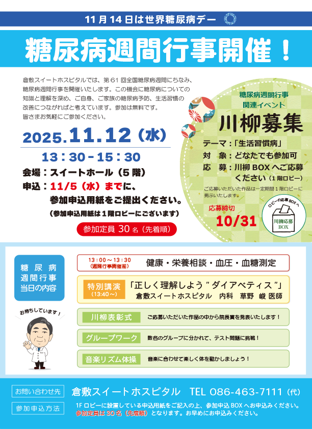 糖尿病週間行事開催のご案内(令和7年11月12日) 2025/9/25 お知らせ 倉敷スイートホスピタルでは、令和7年11月12日(水)13:30~15:30に「糖尿病週間行事」を開催いたします。イベント内容として、内科 草野先生による講演、音楽リズム体操、グループワーク等を予定しております。定員は30名となっておりますので、お早めにお申込みください。また、関連イベントとして、「生活習慣病川柳」を募集しております。どなたでも参加していただけますので、ぜひご応募ください。