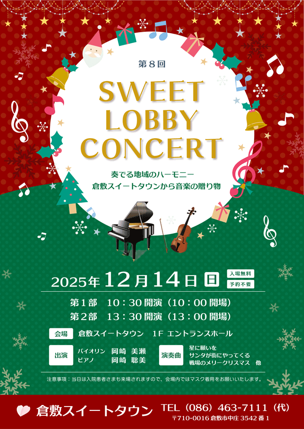 第8回 スイートロビーコンサート開催のご案内(12/14開催) 2025/11/4 お知らせ 倉敷スイートタウンでは、12月14日(日)に「第8回スイートロビーコンサート」を開催いたします。心温まる音色で癒しのひとときをお楽しみください。どなたでもご自由にご鑑賞いただけます。皆さまのご来場をお待ちしています。