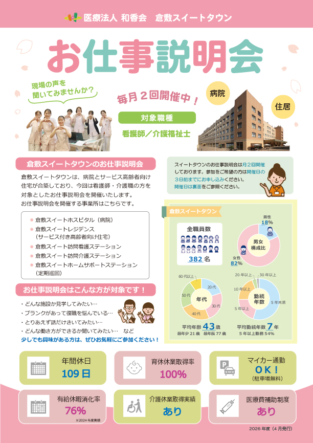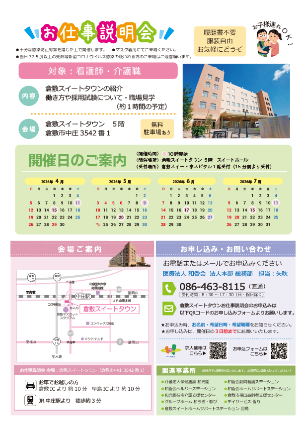 倉敷スイートタウン「お仕事説明会」のご案内 2026/3/27 お知らせ, 説明会 倉敷スイートタウンでは、看護師・介護福祉士を対象にしたお仕事説明会を開催しております。お仕事内容や働く環境についての説明や見学を行います。ぜひお気軽にお越しください。 お仕事説明会のお申込はこちらから お申し込みは、開催日の3日前までにお願いいたします。